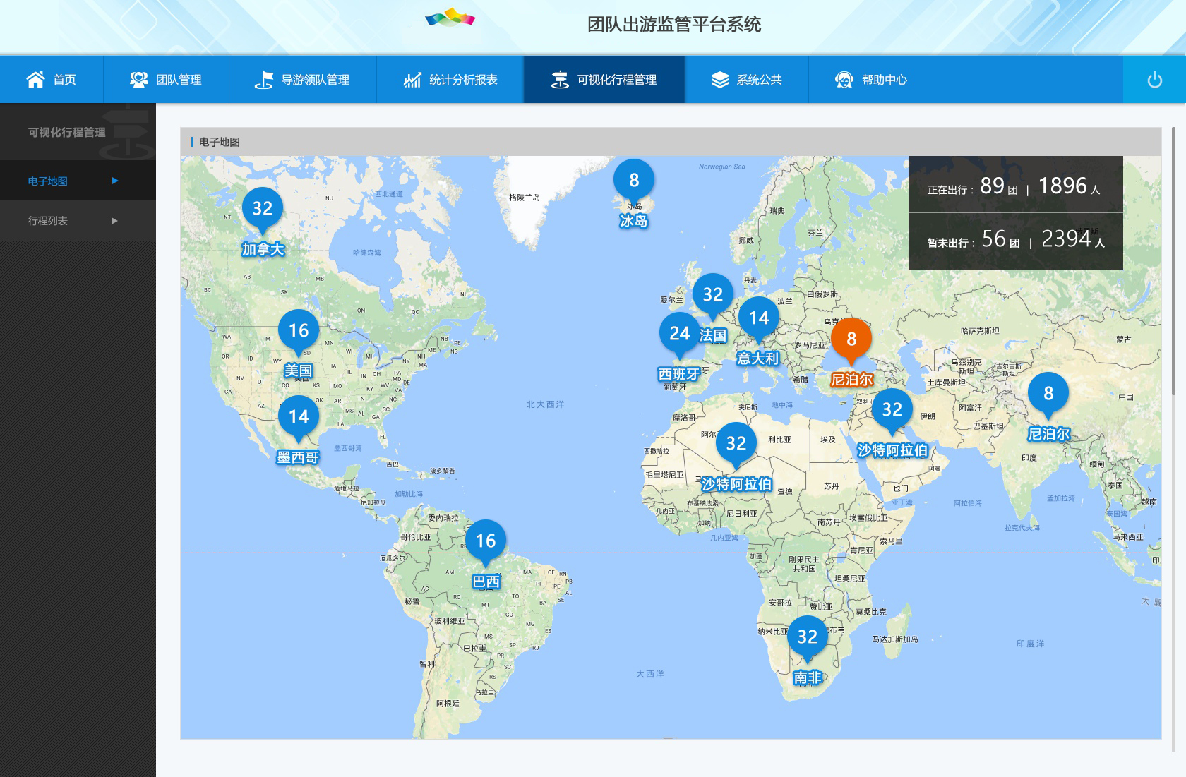 隨著出境旅游門檻越來(lái)越低,出境游熱度持續(xù)升溫,對(duì)出境旅游團(tuán)隊(duì)進(jìn)行有效管控就顯得至關(guān)重要,出境旅游團(tuán)隊(duì)監(jiān)測(cè)與分析系統(tǒng)對(duì)接國(guó)家旅游團(tuán)隊(duì)管理系統(tǒng)數(shù)據(jù),通過(guò)對(duì)旅游團(tuán)電子行程單和旅游合同數(shù)據(jù)的接入,實(shí)現(xiàn)對(duì)出境旅游團(tuán)隊(duì)監(jiān)測(cè),方便在發(fā)生旅游突發(fā)事件時(shí)迅速開(kāi)展救援、服務(wù)工作。