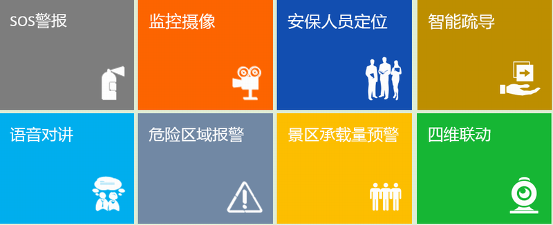 SOS警報(bào)、監(jiān)控?cái)z像、安保人員定位、語音對(duì)講、危險(xiǎn)區(qū)域報(bào)警、景區(qū)承載量預(yù)警、智能疏導(dǎo)、四維聯(lián)動(dòng)等
