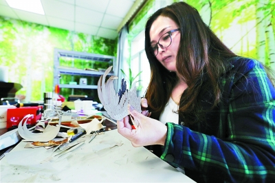 非遺傳承人李艷紅正在工作室內(nèi)制作樹皮畫。