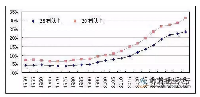 據資料顯示,中國的老齡化擁有兩個世界第一:一是老齡人口數量世界第一;二是老齡化速度世界第一。世界上還沒有任何一個國家,老化得像中國這么迅速。預計到2020年,我國60歲以上老人將超過2.5億,占比為17.5%。2025年,我國60歲以上老人將達到3億,占比為21%,65歲以上老年人比例也將達到13.7%,接近深度老齡化社會,我國將在2027年進入深度老齡化社會。而世界衛生組織的預測,2033年前后中國老齡人口將翻番到4億,到2050年,中國將有35%的人口超過60歲,成為世界上老齡化最嚴重的國家。