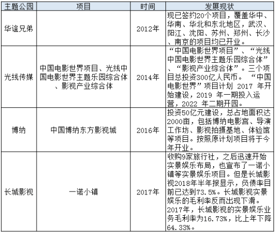 近年來,華誼兄弟、光線傳媒、博納、長城影視等紛紛涉足實景娛樂領域,據悉,奧飛娛樂、歡瑞世紀等國內傳媒公司也有實景娛樂計劃出爐。以主題樂園為發展載體的實景娛樂已經逐漸成為國內影視娛樂巨頭們競相爭奪的肥肉。