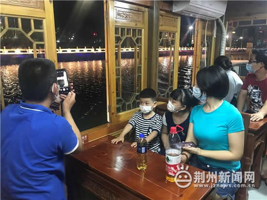 夜幕降臨,華燈初上,荊州古城賓陽樓披上五彩斑斕的“輕紗”,盡顯燈影交織下的絢麗多姿,古老的城墻散發出時尚耀眼的光芒。護城河畔,金鳳騰飛,燈火閃爍、游人如織,一步一景,人文氣息濃厚。一艘艘仿古畫舫穿梭在波光粼粼的護城河上,游客們乘船夜游,在習習涼風中感受著夜色下如詩如畫、美不勝收的古城夜景。來自武漢的游客楊榮一家四口趁著夜晚些許清涼出來游玩,感受和白天不一樣荊州古城。