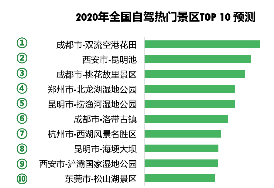 清明假期期間,從自駕出行方面來(lái)看,市民更熱衷于公園、湖邊等戶外區(qū)域,熱門景區(qū)Top10中,成都占3席,西安、昆明各占2席,成都雙流空港花田排名第一。